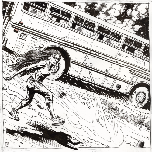 panel comic book, many panels, a line drawing of a woman running after a bus, silly, heavy inked comic book page, detailed link ink, comic book style --v 6.0