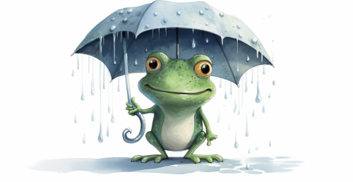 cute cartoon frog standing in the rain with umbrella, on white background --ar 293:151