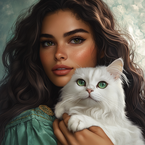 a hyperrealistic 3d image of a beautiful woman with long dark hair and hazel eyes holding her beautiful white persian cat with green eyes. She has a subtle smile on her face.