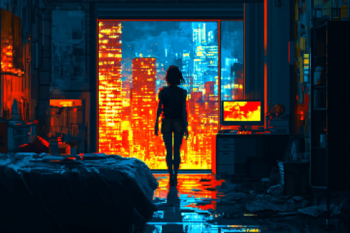pixel art, game art, 8 bit, bedroom scene, tired woman with short brown hair walking through the door, messy bed in the background, desktop computer lit up in the corner, light coming through a large window with a cityscape, neon red and blue colors, dynamic contrast, film noir style --ar 3:2 --v 6.1