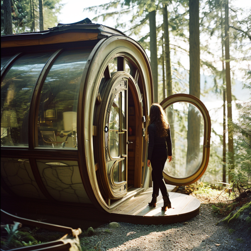 A large format film photo of a 30-year-old woman walking through an art nouveau door of a brand new small luxury cabin with futuristic art nouveau architecture and windows --v 6.0 --style raw