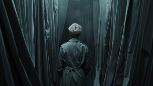 A short blonde hair woman in a trenchcoat walking through flowy curtains in a dark space. Steven Klein style --ar 16:9 --v 6.0