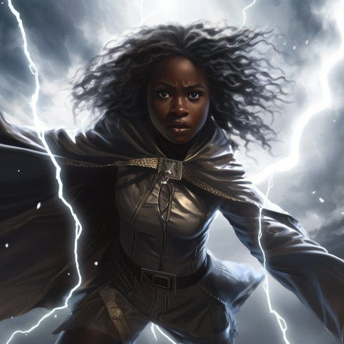 a black african woman flying during a thunderstorms weating synthetic black suit and cape . white long hair and glowing white eyes with lightnings emitting from her hands