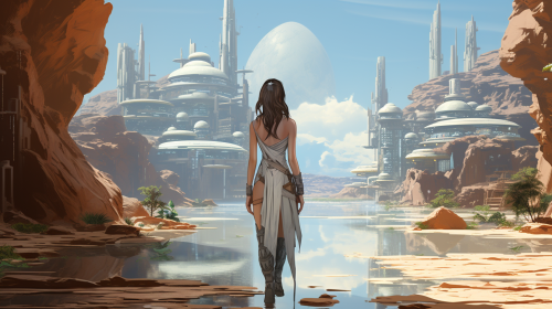 A futuristic woman medic walking through a desert oasis, sunny, concept art, --ar 16:9