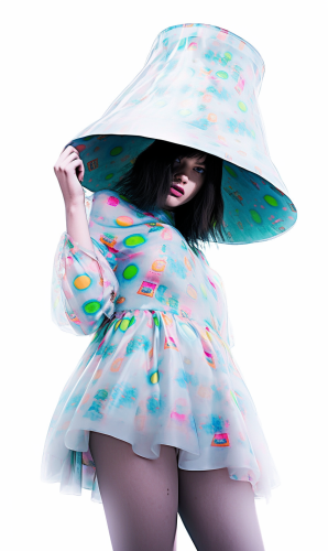 portrait, model wearing oversized dress made out of one bucket hat, Fashion editorial, Hypebeast, white background, --niji 5 --ar 3:5