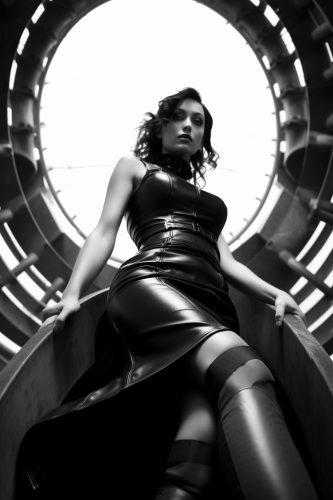woman in latex dress, distinctive black and white photography, unconventional poses, #vfxfriday, rustic realism, site-specific --ar 2:3 --v 5.2