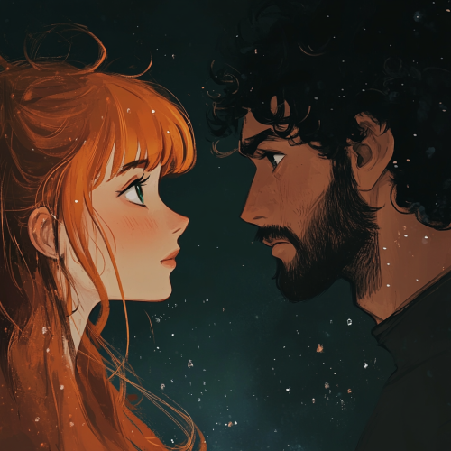 a woman with long orangy brown hair, hazel eyes, and long eyelashes standing looking at a man with curly black hair, brown eyes, and facial hair. They are smiling. Studio Ghibli anime art style, night time, fantasy.