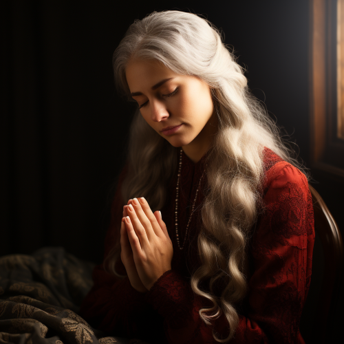 A very beautiful woman with closed eyes and very long, smooth white hair, clasping her hands in prayer --style raw --s 750