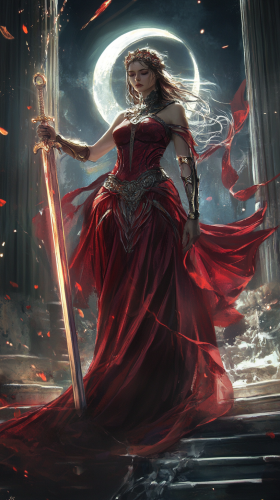 Red High priestess, balance, moon croissant at the feet, dynamic pose, light magic spell, Maiden, beautiful, Rebirth,medieval fantasy, heavy armors, marble Pillars setting, Hathor crown, Franz Frzaetta style, tarot, fantasy, --ar 9:16