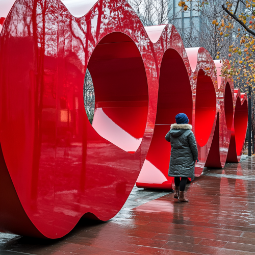 side view of red apple cut out walls arranged behind each other, it is and angled view of the apples so you can see them arranged 1 behind the other and in the middle of the shiny red abble walls is an apple cutout to allow for someone to walk throw. there is a person in a winter coat walking through the apple cut out