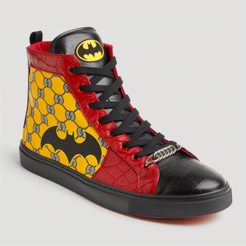 Design a pair of Air Force One sneakers entirely covered by the flag design provided. The sneakers should feature a large red triangle on the sides, with the top half in green and the bottom half in black, replicating the flag's layout. The design should be seamlessly integrated across the entire sneaker, including the sides, toe box, and heel. Ensure the colors--red, green, and black--are bold and vibrant, creating a striking look. Use high-quality materials to preserve the classic Air Force One silhouette and comfort, while highlighting the eye-catching design.