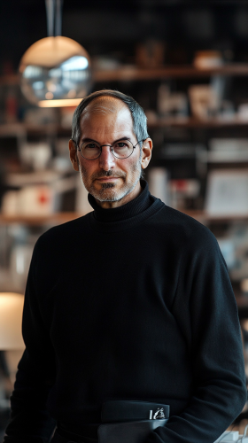 Steve Jobs standing in a creative office environment, surrounded by innovative products, symbolizing dedication to work and striving for excellence. --ar 9:16 --s 250 --v 6.1