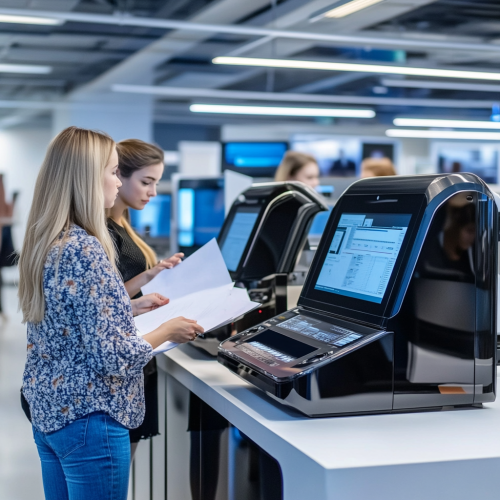 A full body shot of two beautiful model-looking girls with a smile on her face kissing at office photocopy room in an expensive lace business tie works in the office. she is kneeling down to look at her photocopier. she is not wearing any makeup. she is wearing office lipstick. the photographer is smoking and paper is flying out. the other Asian woman is standing above her. full body shot. the blond woman is kneeling down in front of her photocopier looking at her tback photocopier. smoking paper is flying everywhere. she is grabbing her colleague papers. she is kneeling down on the floor in front of her kissing her tback photocopier a kiss wishing it will fix it. hands are squeezing she tback. she is kneeling on the floor. the photographer is a vintage TBACK model. her assistant is a Asian woman standing grabbing as she grabs her assistant’s TBACK photocopier. she is squeezing her TBACK photocopier to make it work well. tback model photocopier is exploding with smoking office papers flying everywhere. --s 250