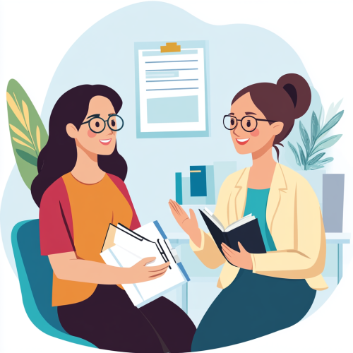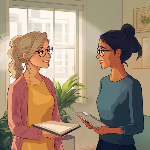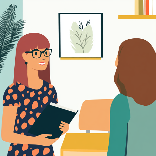 Create a graphic for me about studying psychology, featuring a female psychologist talking to another woman in an office. The psychologist is holding a notebook and wearing glasses. Both women should be smiling. The image should be realistic and vivid.