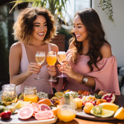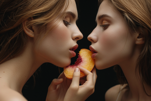Photograph. Side view. Close-up of two beautiful women with light brown hair. They are facing each other. They are sharing a peach slice. The peach slice is very juicy. Lips parted. Eyes closed. Perfect hands. They are gasping. Black background. --no freckles, pit --ar 3:2 --v 6.0