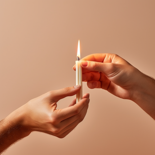 on a beige background, a woman holds a candle in her palm, and a man holds a burning match above his palm --v 5.2 --style raw