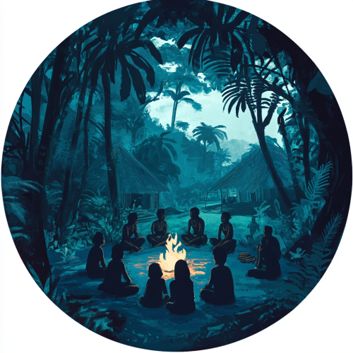 Inspired by the Amazonian rainforest and Festa de São João, show minimal silhouettes of skeletal figures blended with jungle leaves, lit in ghostly green hues, embodying spirits within nature --ar 16:9 --v 6.1