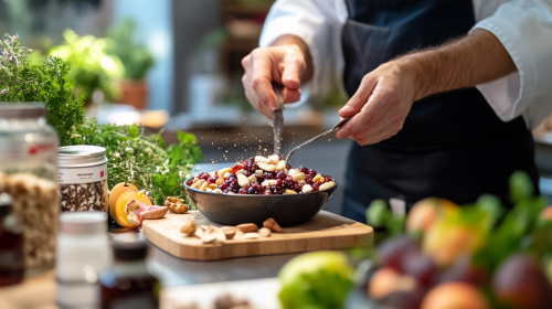 A vibrant, modern kitchen scene where a health-conscious chef is preparing a delicious low-calorie dessert. The chef is mixing maltodextrin as a partial sugar substitute into the recipe, surrounded by fresh ingredients like colorful fruits, nuts, and a sleek jar of maltodextrin. The kitchen is bathed in warm natural light, with wooden accents and greenery, creating an inviting atmosphere. The dessert being prepared looks both indulgent and healthy, perfectly balancing sweetness with reduced calories. The scene captures the essence of innovative cooking with a focus on wellness and taste --ar 16:9