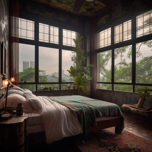 A cozy bedroom on the top floor of a four-story building in a sprawling, industrialized jungle city with a humid subtropical climate. Rain pours outside, visible through large windows that overlook the dense jungle and the urban sprawl below. The city’s architecture blends indigenous American, particularly Amazonian, heritage with subtle industrial elements. The room features natural materials like woven fibers, carved wood, and vibrant handwoven textiles, with ancient symbols and bioluminescent accents. The setting feels both urban and deeply connected to the lush environment, creating a warm, inviting refuge high above the rain-soaked city. --v 5.0