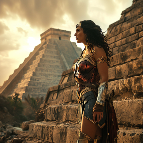 Imagine Wonder Woman, in her iconic armor, standing in front of a full-length mirror in her room. She is carefully examining her reflection, adjusting her tiara and smoothing out her outfit. The room is tastefully decorated, reflecting her Amazonian heritage with classical and warrior-inspired motifs. The mirror captures her entire figure, allowing her to see the complete ensemble, from her armored boots to the lasso at her side. This scene portrays a moment of preparation and personal care, showcasing Wonder Woman’s strength and elegance as she ensures her appearance is impeccable. --ar 9:16 --v 6.0
