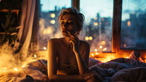 A waist-up photo of 32 year-old, beautiful, hip, skinny woman in the style of Marat Safin, pale skin, light hair, city lights through window, sheer top with spaghetti straps, in bedroom of modest Parisian apartment decorated with youthful fun aesthetic, looking at camera, huge pile of pillows, smoking cigarette, room full of smoke --ar 16:9 --v 6.0 --style raw --s 50