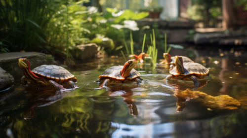 a photorealistic view of seven box turtles swimming in backyard garden pond --ar 16:9 --v 5.2