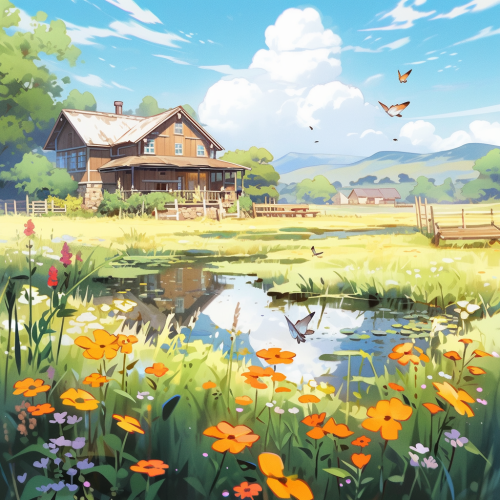A farmhouse next to a pond. There is a hummingbird gathering nectar in the foreground of the painting. ar4:2 --s 250 --niji 5