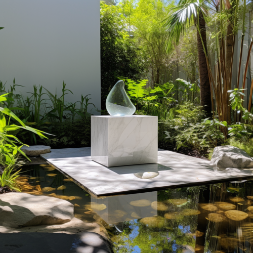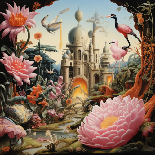 an illustration of a pond inside a beautiful garden, tenticles poke out above the water to mingle with the flowers above, painted in the style of classical rococo, traditional oil painting, pastel color