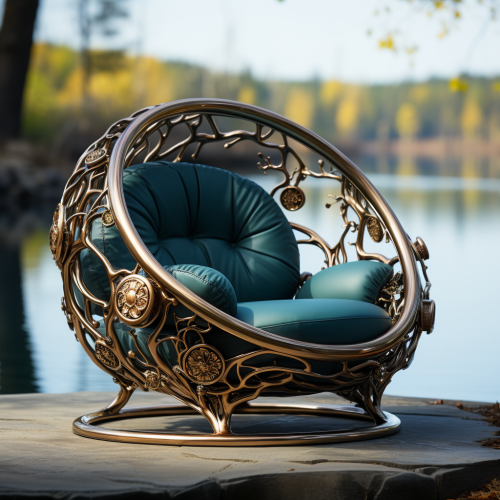 a green chair made out of branches in front of a lake, in the style of dark cyan and light bronze, functional aesthetics, oleksandr bogomazov, functional design, wood, storybook-like, captivating --s 750