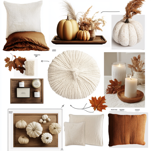 A minimalist, autumn-themed mood board collage displaying only separate home decor elements, isolated as if cut out from individual photos (no room visualizations). Each item should be showcased distinctly with space between, including warm, soft blankets (some with subtle patterns, some in faux fur), throw pillows in fall colors, elegant designer candles, miniature pumpkins, dried leaves, and rustic wooden trays. Ensure there are only a few elements on the board for clarity, each labeled in Ukrainian with italic text, such as ‘вовняний плед,’ ‘порцеляновий гарбуз,’ and ‘текстурована подушка,’ using clean arrows to connect the labels to the decor items. Keep the background neutral to emphasize the warm autumn hues.