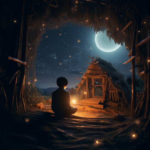 cinematic scene of a village hut, it is dark with lightining flashes. This visual representation captures the essence of African mythology, This is an ultra-realistic photograph captured on high-resolution 35mm film. --ar 16:9