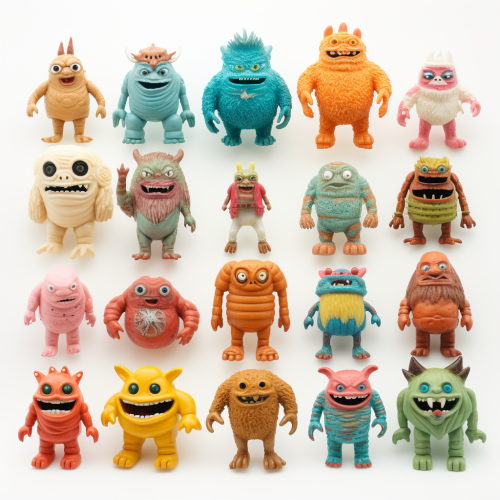 small collection of different 1960s Japanese bootleg toy monster characters, injection molded plastic, low detail , no moving parts, low detail, crude painting, Japanese plastic toy action figure on white background --v 5.2