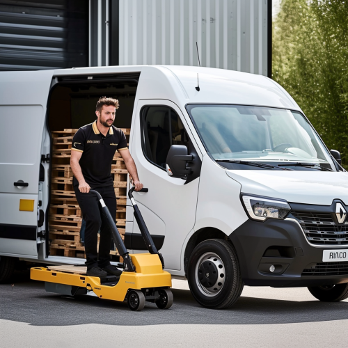 A courier in a black polo shirt loading a white Renault Master van using a hand pallet truck --v 6.0 --s 50