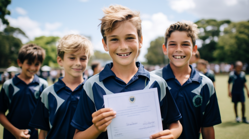 A photorealistic photo of kids from new zealand wearing dark navy tee shirt holding a sport certificate - Full body photo - Looking at camera and smiling - background school cricket field - high detail, high resolution, dynamic lighting --ar 16:9