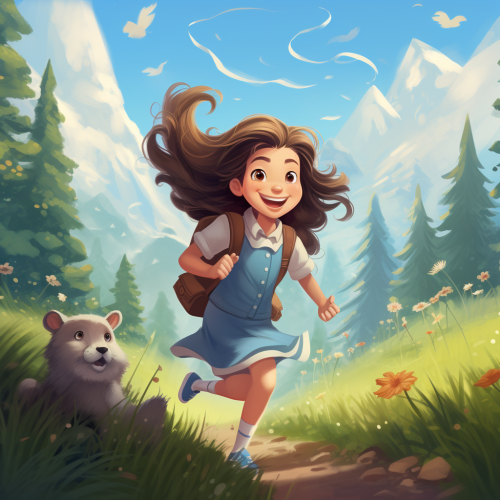 An adorable young girl with blown hair pigtails, around 7 years old, smiling and laughing while playing in a grassy meadow surrounded by trees flowers and mountains with squirrel. She is wearing a blue dress and white shoes carrying backpack . Cartoon style illustration of a character named Mimi for a children's book cover page.