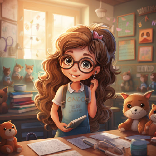 A full page illustration showing a girl Mimi with blown hair as a teacher in a classroom with her stuffed animals. She wears glasses and stands by a chalkboard, pointing to math and spelling lessons. The animals are at desks, listening attentively. The scene captures Mimi's imagination as she plays school. The style is warm, playful and fun.