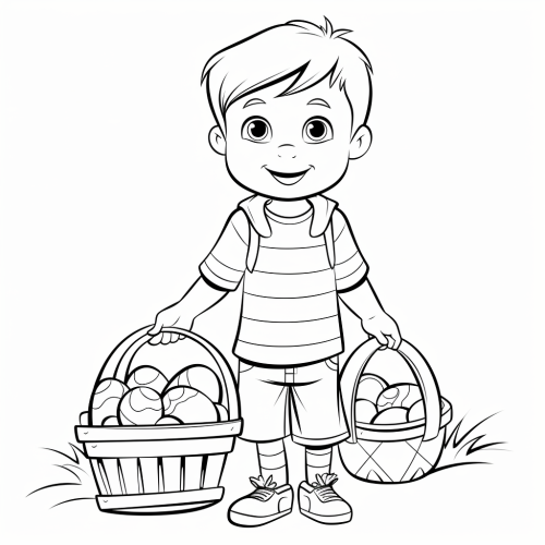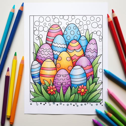 A coloring page featuring a woven basket overflowing with intricately designed Easter eggs. The eggs have various patterns, such as stripes, polka dots, and swirls, inviting children to use a spectrum of colors. The image is drawn with clear, bold lines for easy coloring. --chaos 35 --ar 17:20 --v 6.0 --stylize 500