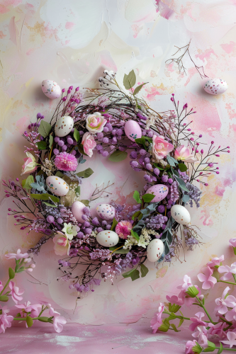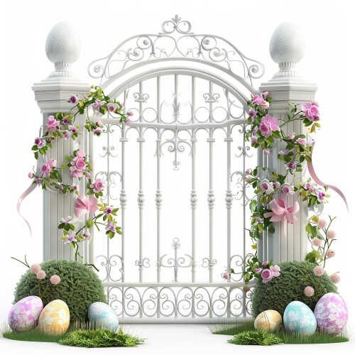 easter gate, flowers, ribbon and eggs around the gate. ornament white gate.