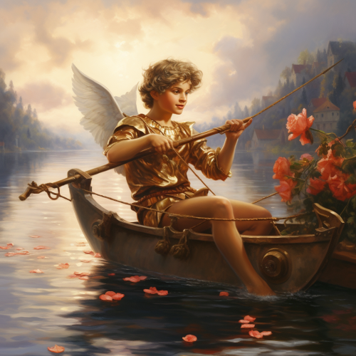 A detailed illustration of Cupid shooting an arrow, Cupid's characteristics finely detailed, in the center against a dark backdrop. Minimalist but distinct background elements. Created Using: pointillism effect, monochrome palette, high contrast, emphasis on texture, precise dot placement, chiaroscuro lighting, X cupid arrow, hd quality, natural look --ar 1:1 --v 6.0