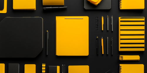 High-resolution image of an organized files on a table in yellow. The background is black and clean. The design is modern and clean, with a tech-centric, digital theme --ar 2:1