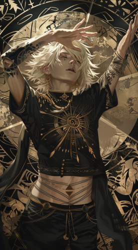 an anime male with blonde hair standing and waving his arms, in the style of dark black and light beige, hopi art, dark white and light gold, meticulous design, solapunk, mural painting, close up v6 --ar 71:128