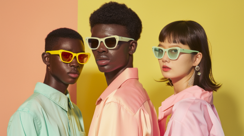 an asian young male, a black young woman, white young male, with an asian young woman stand straight on in an upright pose looking at camera wearing modern straight edged styled sunglasses with a summer coloured inspired gradien background, inspired by Wes Anderson, wearing lightly coloured complimentary pastel colour clothing, fashion photography, realistic, high definition, subjects positioned to the right of the frame --ar 16:9 --style raw --v 6.0