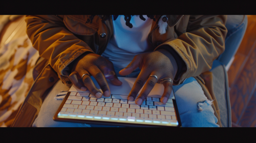 A video enthusiast is editing a video on his iPad, African American, with fluffy hair, wearing a brown jacket and light blue pants, long fingers tapping on the keyboard, healthy skin tone, high-definition and realistic skin, close-up shot of the Magic Keyboard, shot with Sony a7III, rich in detail, lifelike --ar 16:9 --v 6.0