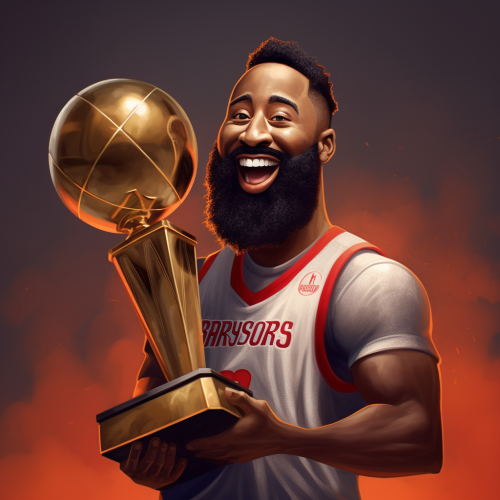 james harden, in a clippers jersey, pixar version, holding up the larry obrien trophy