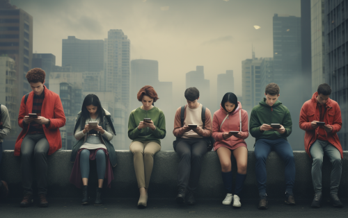 photo of depressed young men and women staring at their cell phones in a city landscape, style of wes anderson, realistic --ar 16:10