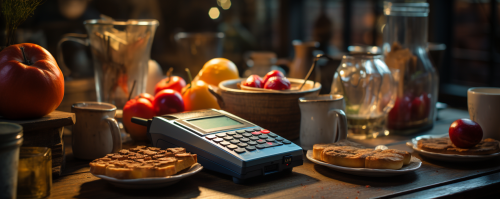 concept of contactless payment through a terminal, all items on the table, photo style, top view, cinematic light, realism --ar 5:2 --s 750