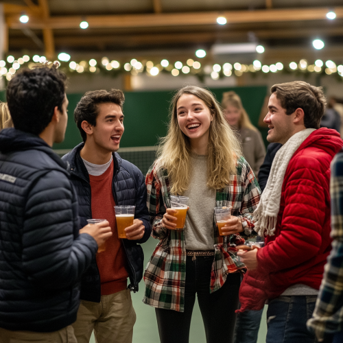 Wide shot, f/2.8, 16–35mm lens, candid snapshot of a group of young, attractive people in their mid-twenties, reuniting for a homecoming celebration at a padel or pickleall court. The group, who looks like they've attended Yale and UVM, is dressed casually in the classic Vineyard Vines style--wearing a layered up mix of sporty active clothing, garment-dyed sweats, sherpa pullovers, washed flannel shirts in festive holiday tones. They are in an indoor warming hut, enjoying a holiday darty (daytime party) with beers and hot toddies in hand, laughing and catching up. Festive christmas lights adorn the trees background where you can also see the padel court, adding holiday cheer. It’s a bright, sunny winter day, capturing the lively, carefree energy of the moment. Shot in the style of Bruce Weber with an all-American, hyper-realistic vibe. 33mm, 3:2 aspect ratio, chaos 0 for a natural, joyful feel.
