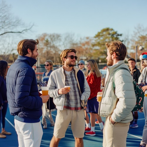 Wide shot, f/2.8, 16–35mm lens, candid snapshot of a group of young, attractive preppy people in their mid-twenties, reuniting for a homecoming celebration at a pickleball court. The group, who looks like they've attended Yale, University of Texas, and UVM, is dressed casually in multiple layers of vibrant, festive colors, wearing cozy fleece, sherpa, and faded sweats in the signature Vineyard Vines style. They are gathered outside a warming hut near the pickleball court, enjoying a lively holiday darty (daytime party) with beers and hot toddies in hand, laughing and reconnecting. Christmas lights twinkle on the trees in the background, where the padel court adds a sporty, celebratory feel. The bright, sunny winter day amplifies the joyful, carefree energy of the moment. Shot in the iconic style of Bruce Weber with a crisp, clean all-American, hyper-realistic aesthetic. 33mm, 3:2 aspect ratio, chaos 0 for a vibrant, natural, and festive atmosphere.