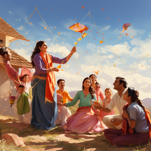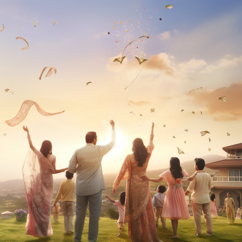 luxury & rich indian family flying kites with friends celebrating makar sankranti at their luxury holiday home, make it photo realistic, high defination, 48k