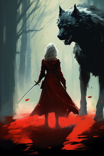 Little Red Riding Hood, a young girl with a red cloak, walking cautiously through a dense forest. The path is narrow, and towering trees create a dark canopy above her. The atmosphere is eerie yet magical, evoking the nostalgic feel of 1980s storytelling, with soft lighting filtering through the leaves. --ar 16:9